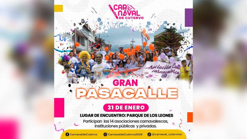 El evento tendrá como punto de encuentro el Parque de los Leones y contará con la participación de las 14 asociaciones carnavalescas, así como instituciones públicas y privadas, que recorrerán las principales calles con música, danzas, comparsas y alegría, reafirmando la identidad cultural y el carácter integrador del carnaval cutervino.